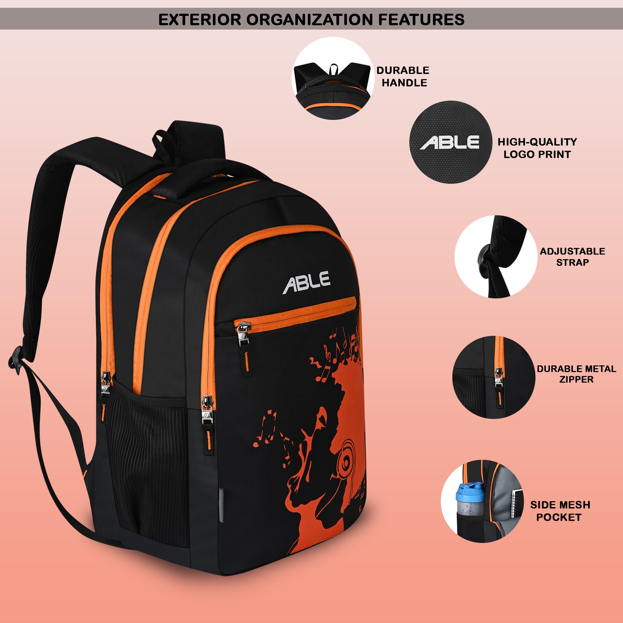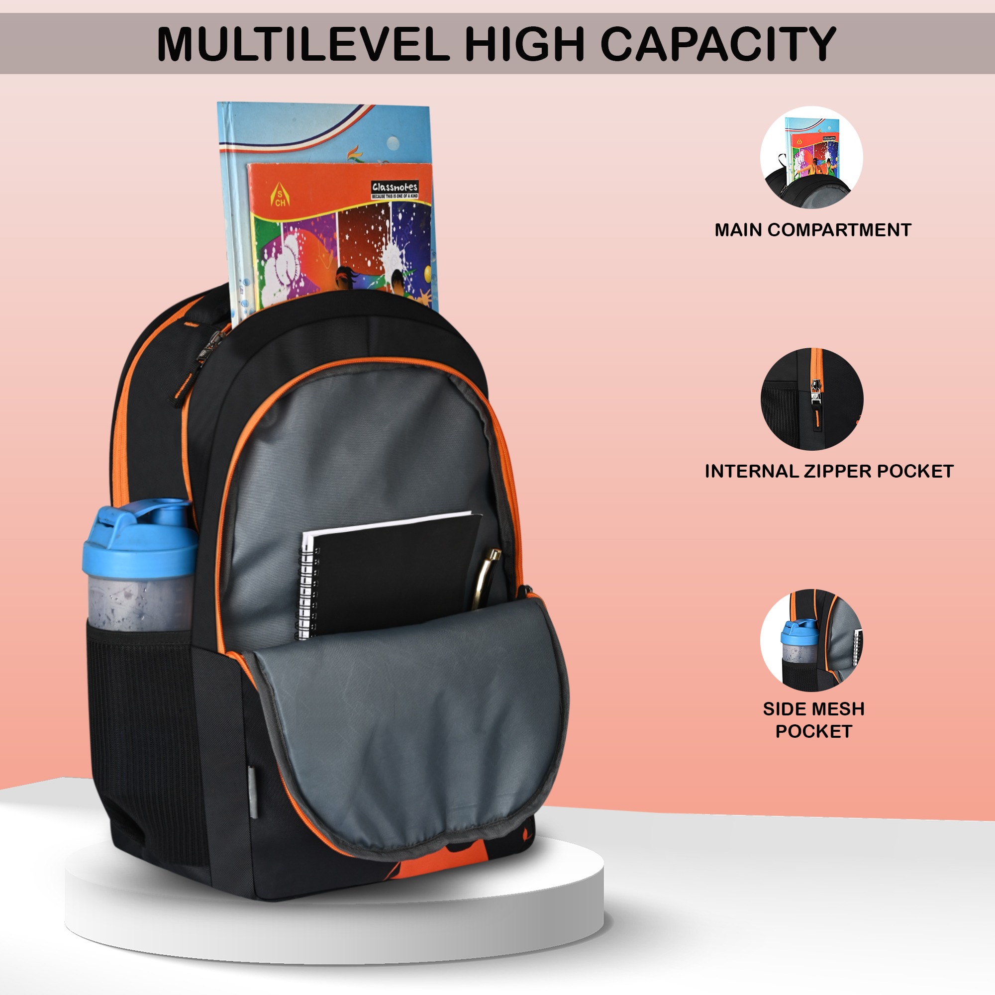 | Multiple Compartments | Comes with multiple pockets to keep items organized like stationery, bottles, and gadgets. |
